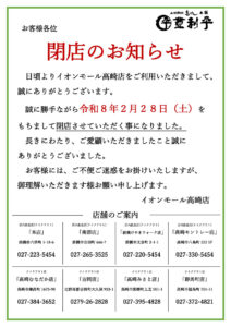 【イオンモール高崎店】閉店のお知らせ(追記)