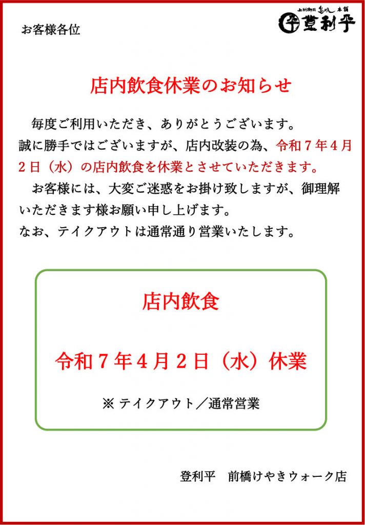 【前橋けやきウォーク店】店内飲食休業のお知らせ