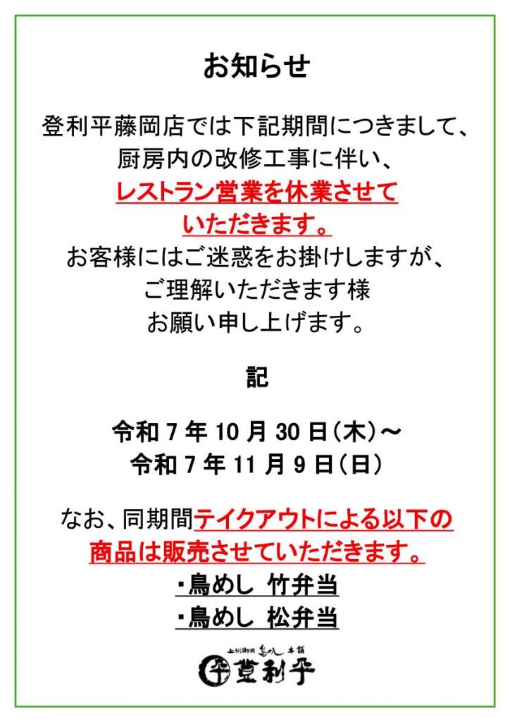 【藤岡店】レストラン営業一時休業のお知らせ