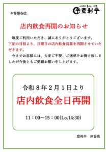 下記の日程より、日曜日の店内飲食営業を再開させていただきます。