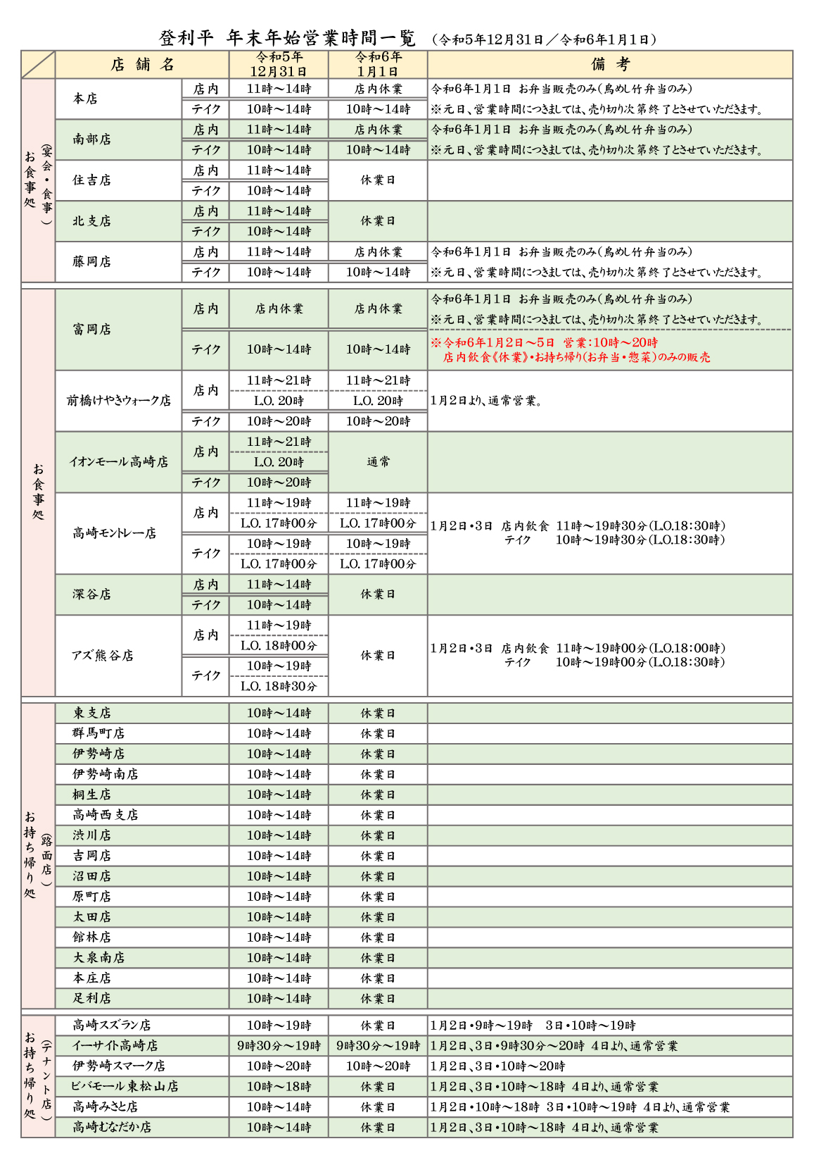 令和5年-6年 年末年始営業時間一覧表